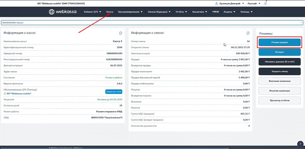 Рисунок 8 – Где найти раздел «Режим продаж» в личном кабинете Webkassa