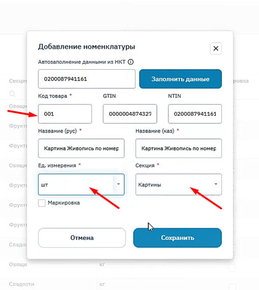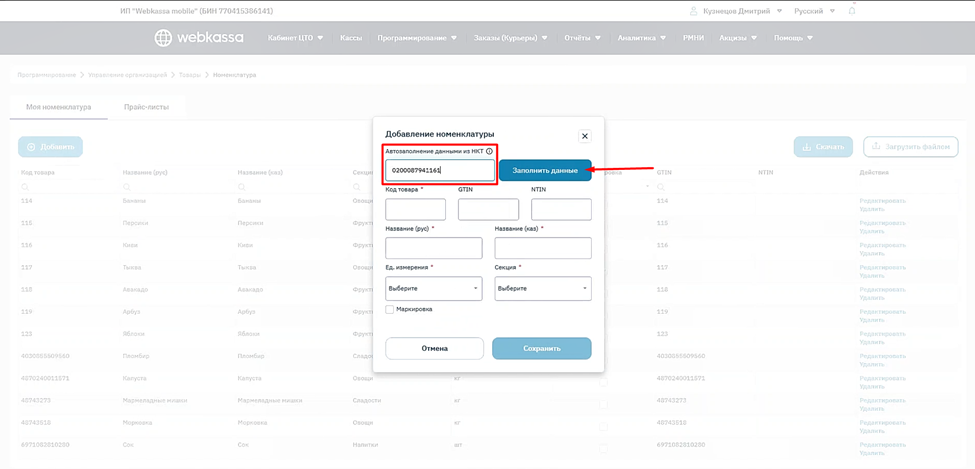 После этого Webkassa находит товар в НКТ и автоматически заполняет(рис. 4):