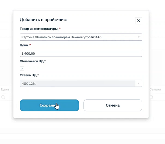 Шаг 6. После сохранения товара в номенклатуре вам нужно добавить этот товар в прайс-лист.