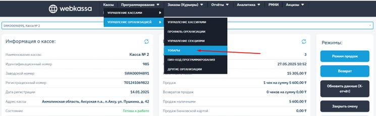 Рисунок 1 – Где найти раздел «Товары» в личном кабинете Webkassa