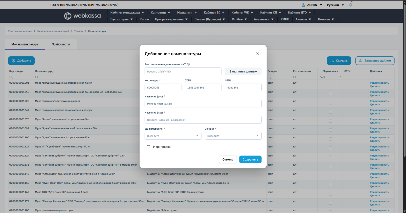 Вариант 2. GTIN передается с интерфейса Webkassa.