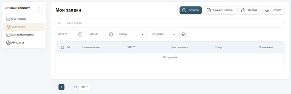 - В разделе “Мои заявки” отображаются ваши поданные заявки на регистрацию товара и присвоение NTIN товару.