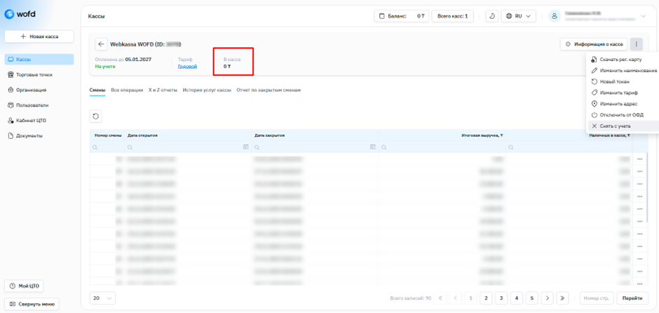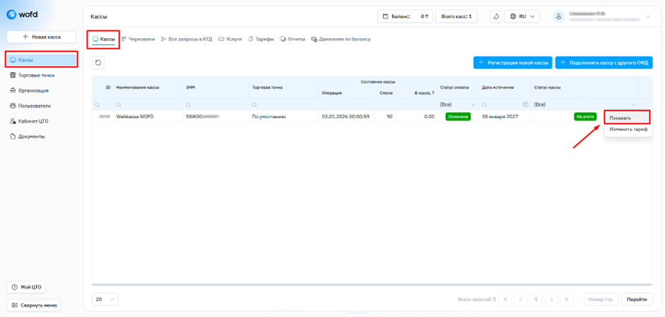 Шаг 3. Вам откроется ваш Личный кабинет WOFD. В разделе “Кассы” выберите кассу, которую вы хотите снять с учета, нажмите меню (3 точки) напротив нужной кассы и далее нажмите “Показать”