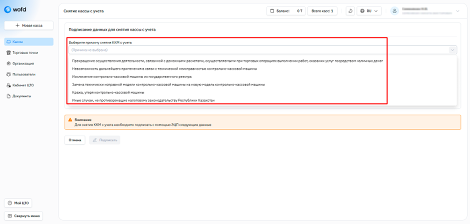 Шаг 6. Укажите причину снятия кассы.