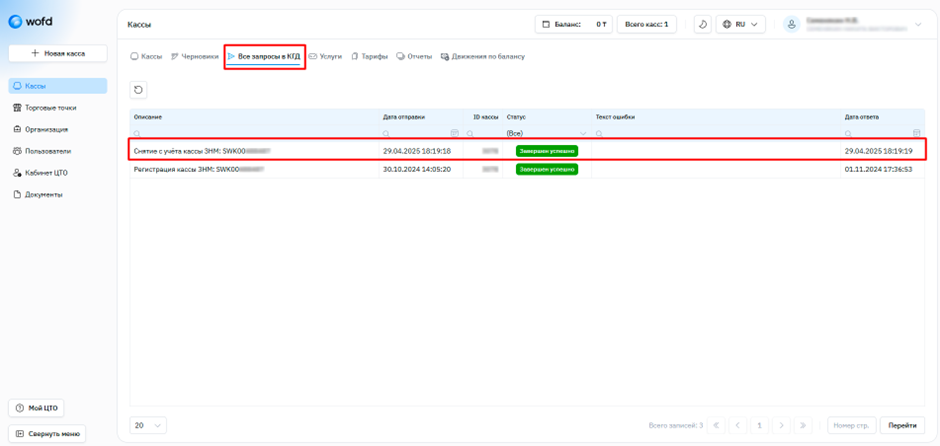 если при перерегистрации ККМ в кабинете ОФД изменился регистрационный номер или ID кассы, такую кассу необходимо снять с учета и зарегистрировать заново. После этого остаток лицензии можно перенести со «старой» ККМ на «новую».