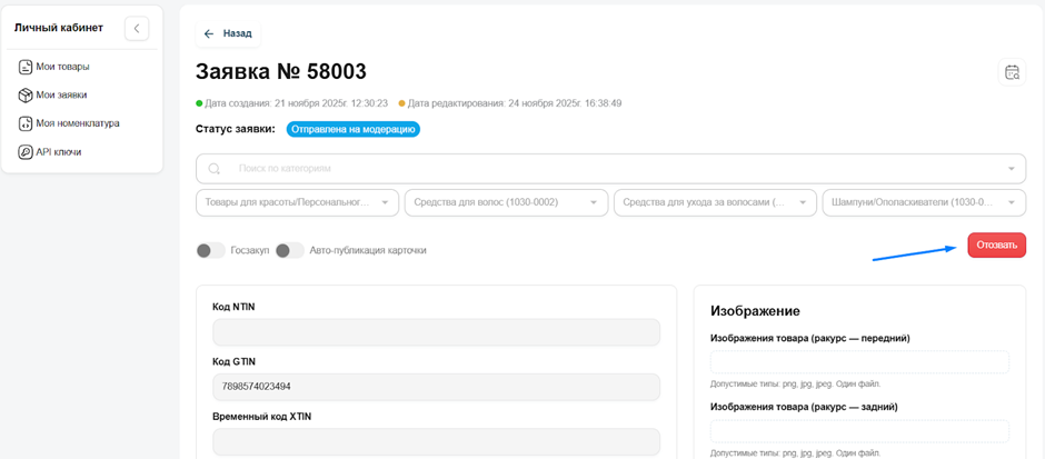 - В разделе “Мои заявки” отображаются ваши поданные заявки на регистрацию товара и присвоение NTIN товару.